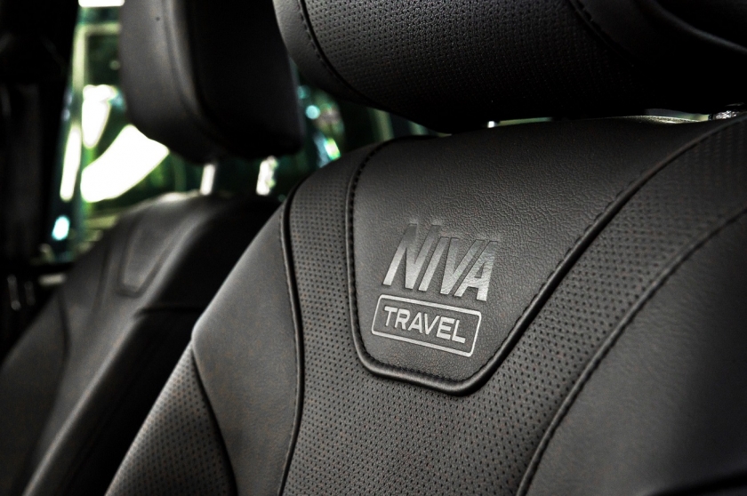 Натуральной кожей обтянуты сиденья, рулевое колесо, центральный подлокотник. Для сидений был спроектирован оригинальный дизайн: центральная часть переднего сиденья, боковая поддержка и вставка в подголовнике выполнены из перфорированной кожи. Аналогичным образом оформлены места посадки пассажиров на задних сиденьях. На спинках передних кресел выполнено тиснение NIVA Travel.