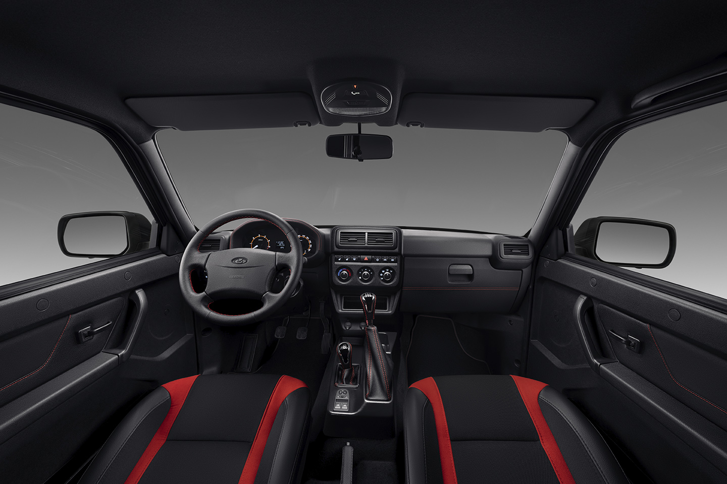 Салон оформлен в черно-красных тонах с логотипами LADA Sport на сиденьях. Эргономика адаптирована к скоростному вождению: рулевая колонка регулируется по наклону, рулевое колесо обшито кожей. Раздаточная коробка оснащена однорычажным приводом.
