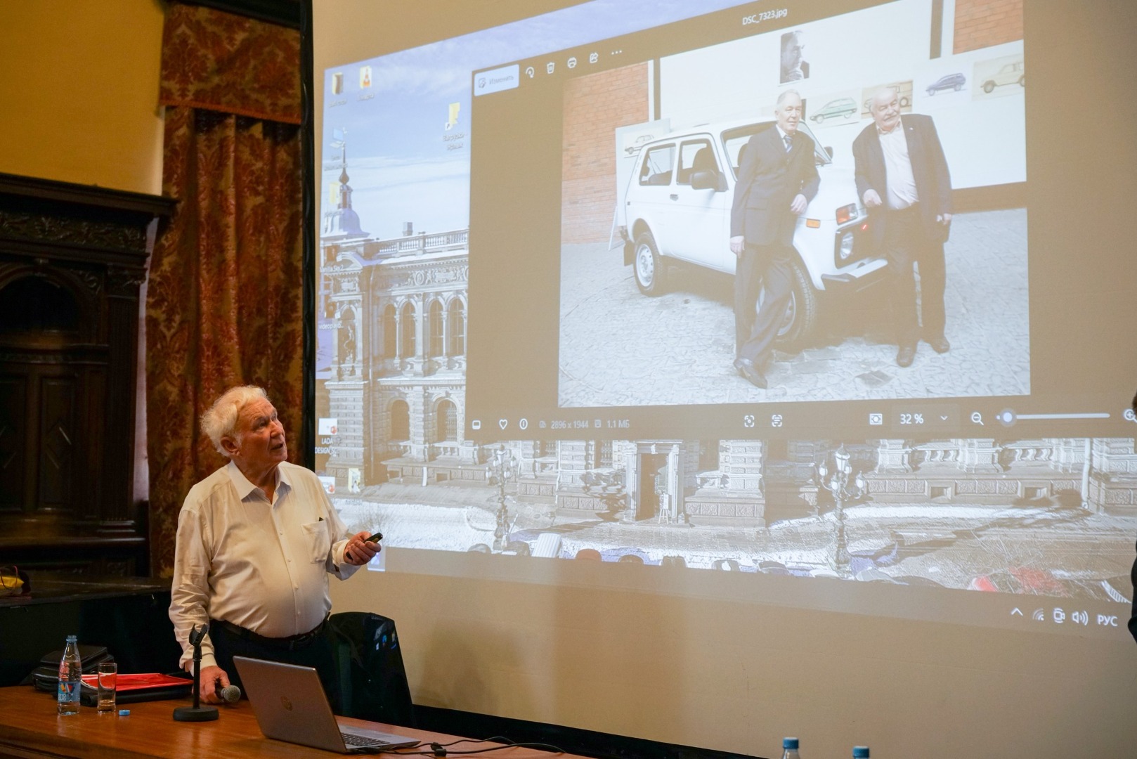 В актовом зале, где собралось более 80 студентов и 10 преподавателей, с приветственным словом выступила ректор Анна Кислицына. Валерий Павлович поделился воспоминаниями о годах учебы, своей карьере на АВТОВАЗе и истории создания легендарного внедорожника LADA NIVA. На большом экране демонстрировались архивные фотографии с этапами разработки дизайна и конструкции автомобиля.