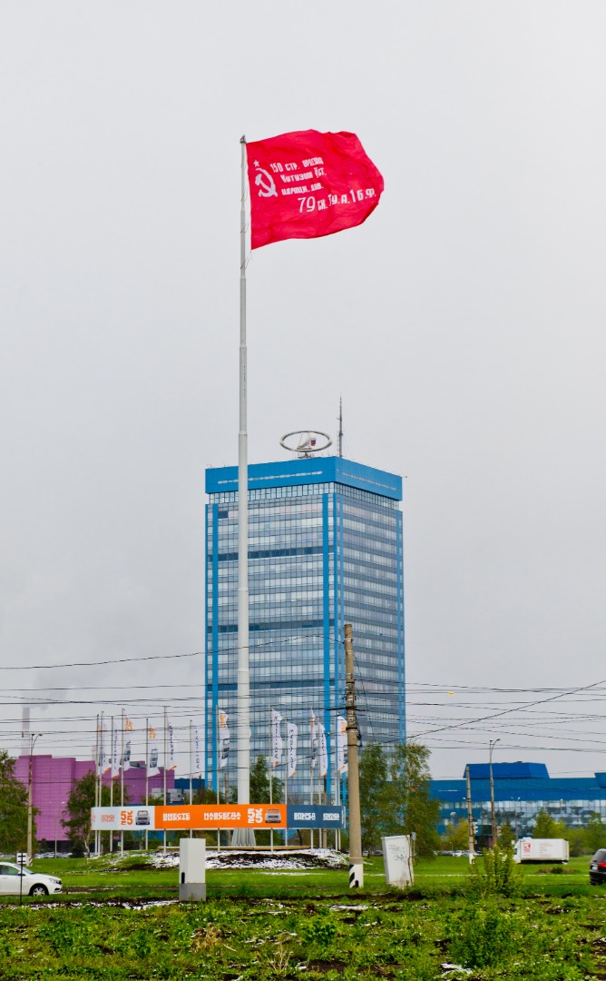 В честь грядущего 80-летия Победы в Великой Отечественной войне АВТОВАЗ поднял Знамя Победы на самом высоком флагштоке в городе Тольятти.