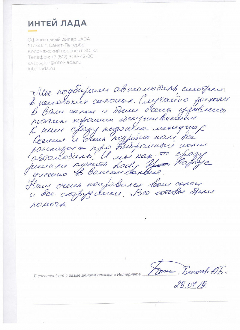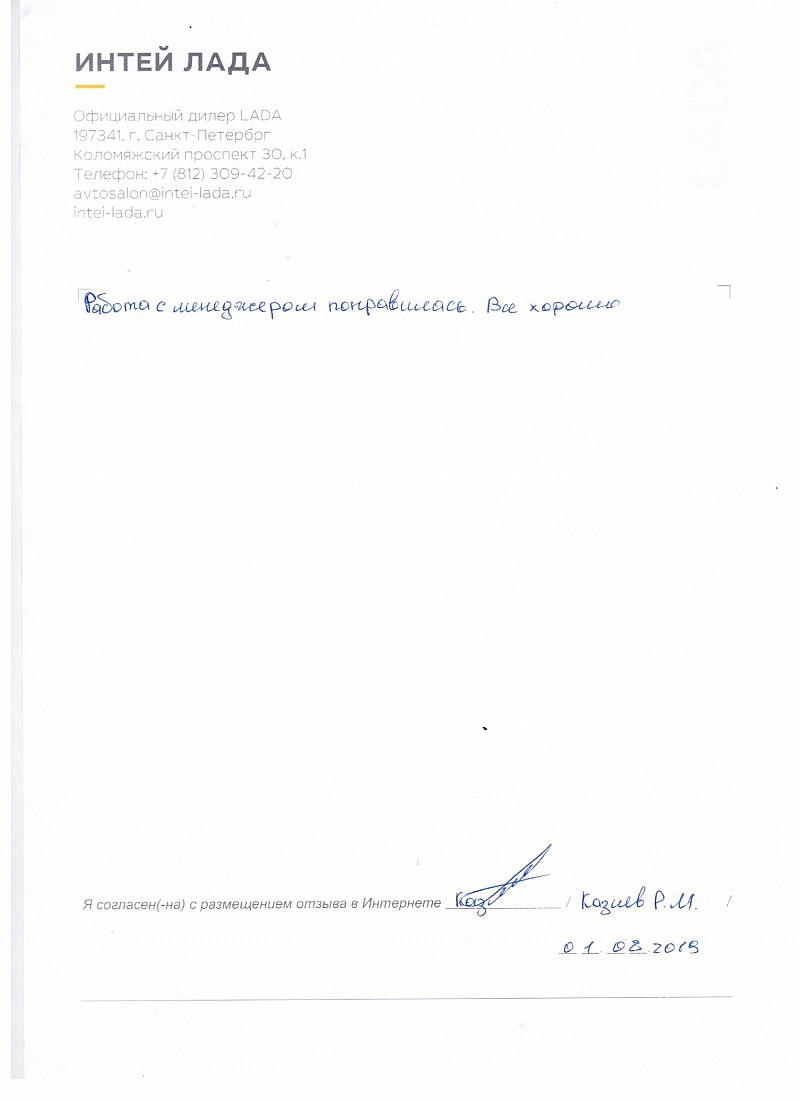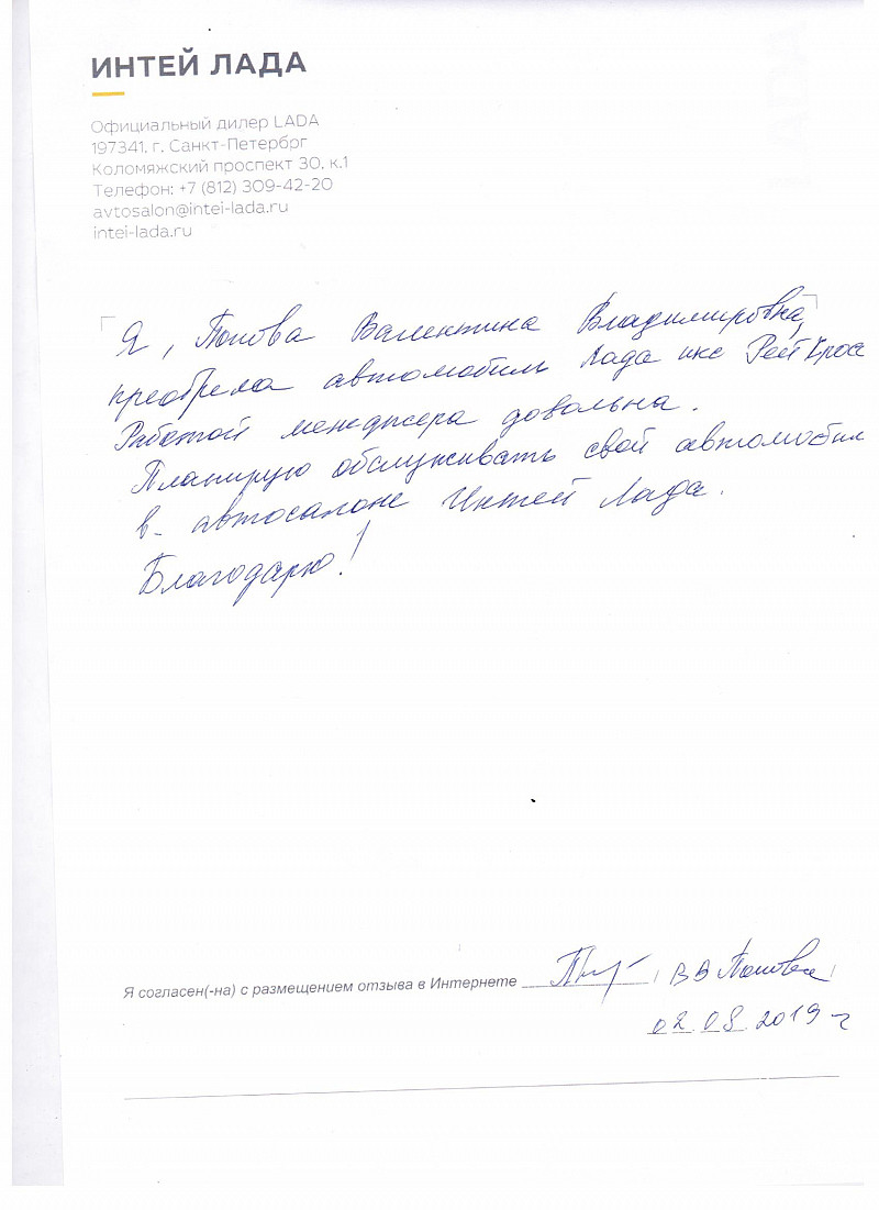 Я, Попова Валентина Владимировна, приобрела автомобиль Лада икс Рей Кросс. Работой менеджера довольна. Планирую обслуживать свой автомобиль в автосалоне Интей Лада. Благодарю! |