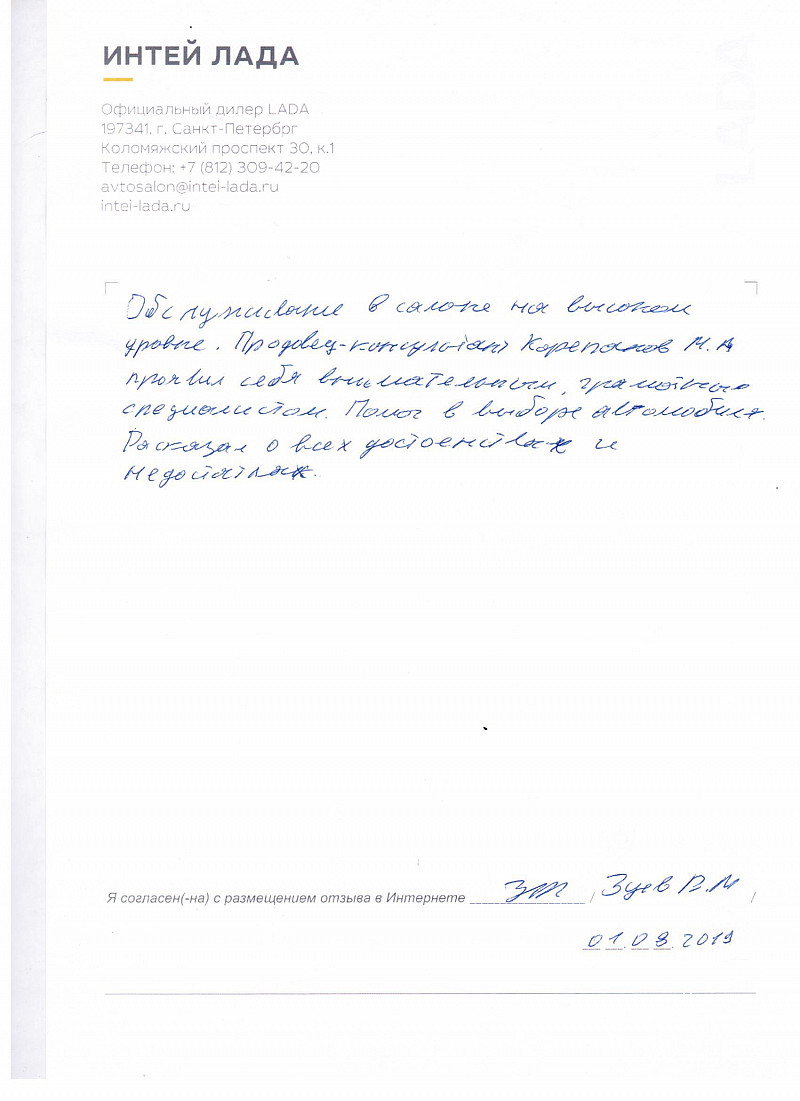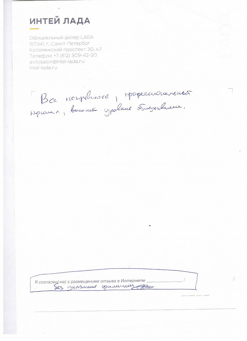 Я, Гусманов Роберт Габдулбарович приобретал автомобиль Лада Веста. В салоне Интей Лада. Посетил все салоны в Спб. Этот салон понравился мне больше всего. Выражаю большую благодарность менеджеру салона Андрееву Анатолию, за помощь в выборе комплектации по авто. А также большая благодарность Сергеевой Елене Сергеевне, Фомичевой Юлии, за оформление документов. И сотруднику ВТБ Воробьевой Евгении. |