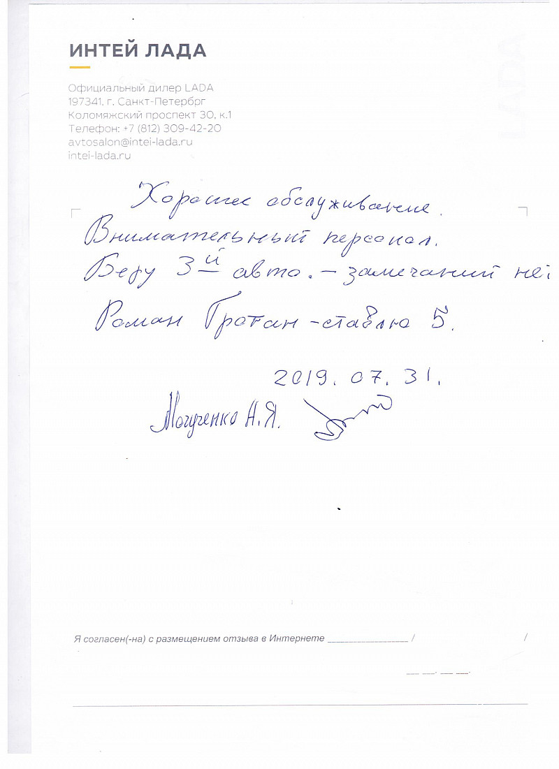 Хорошее обслуживание. Внимательный персонал. Беру 3-й авто - замечаний нет. Роман Гротан - ставлю 5. |