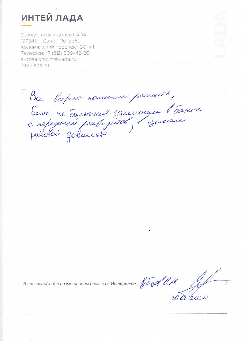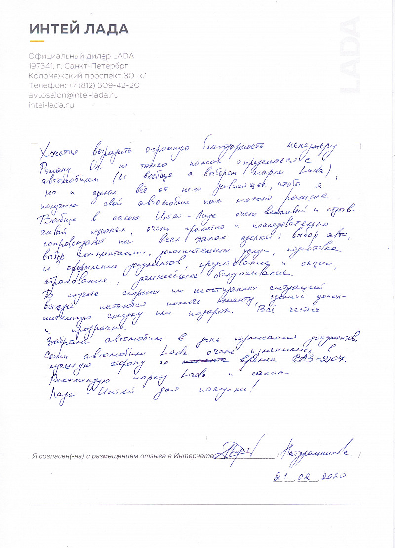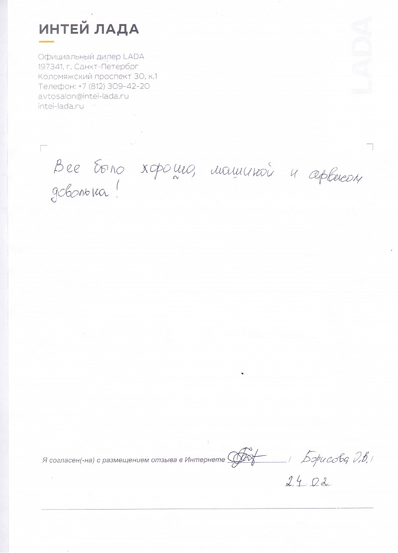 Хочется выразить огромную благодарность менеджеру Роману. Он не только помог определиться с автомобилем (и вообще с выбором марки Lada), но и сделал все от него зависящее, чтобы я получила свой автомобиль как можно раньше. Вообще в салоне Интей- Лада очень вежливый и отзывчивый персонал, очень грамотно и последовательно сопровождают на всех этапах сделки: выбор авто, выбор комплектации, дополнительных услуг, подготовка и оформление документов, кредитование и опции, страхование, дальнейшее обслуживание. В случае спорных или неожиданных ситуаций всегда пытаются помочь клиенту, сделать дополнительную скидку или подарок. Все честно и прозрачно. Забрала автомобиль в день подписания документов. Сами автомобили Lada очень изменились в лучшую сторону со времен ВАЗ-2107. Рекомендую марку Lada и салон Лада-Интей для покупки! |