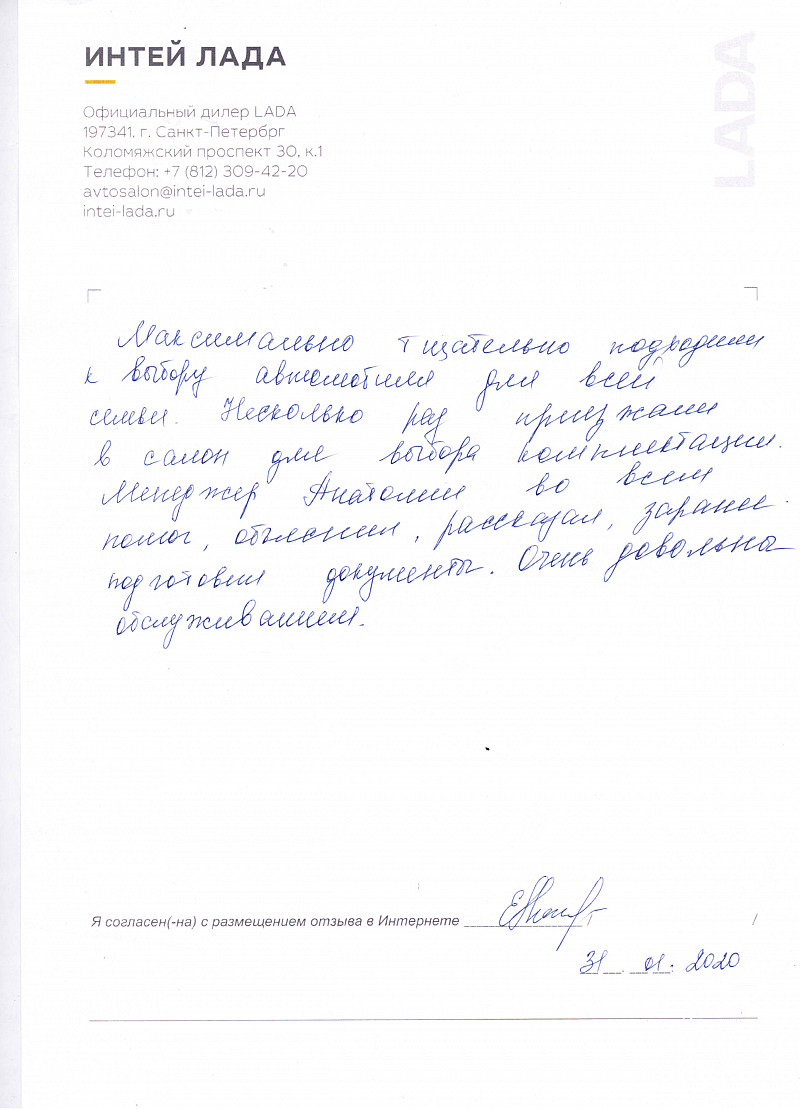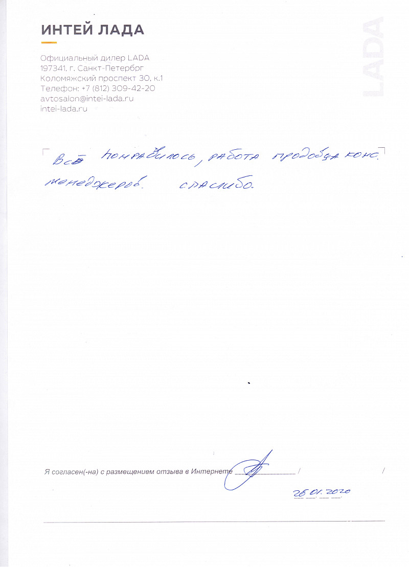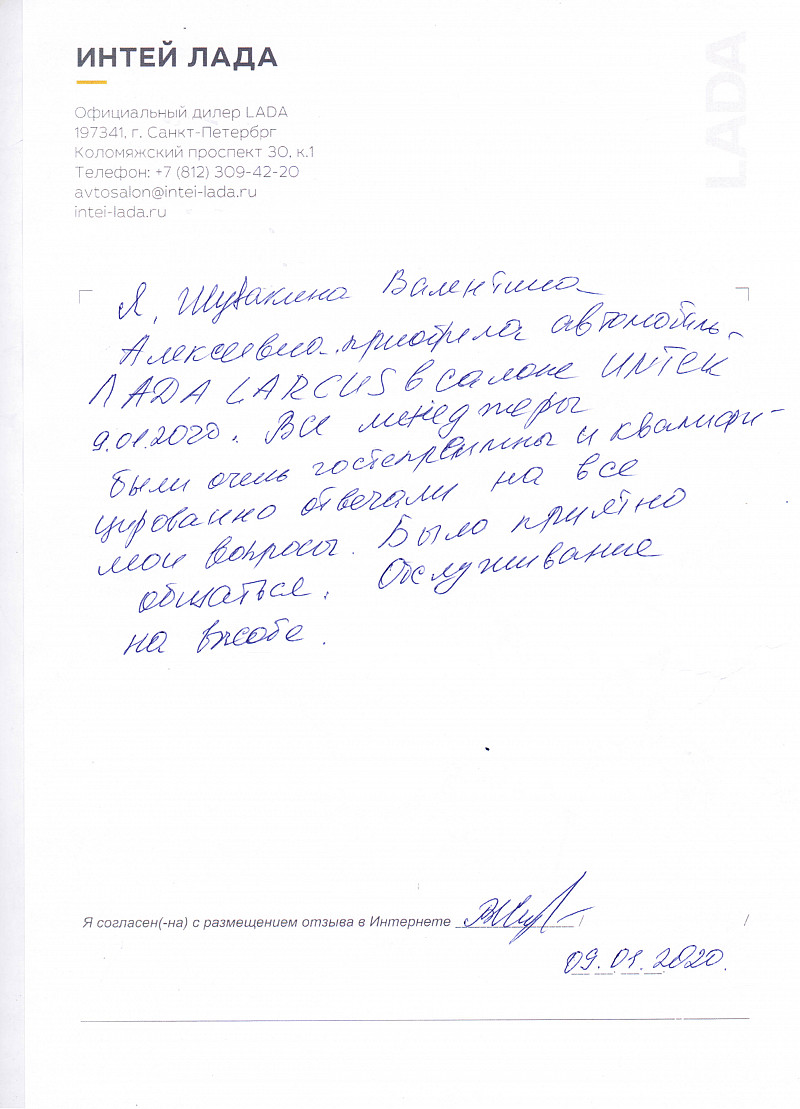 Я, Шувакина Валентина Алексеевна, приобрела автомобиль ЛАДА LARGUS в салоне ИНТЕЙ 09.01.2020. Все менеджеры были очень гостеприимны и квалифицировано отвечали на все мои вопросы. Было приятно общаться. Обслуживание на высоте. |