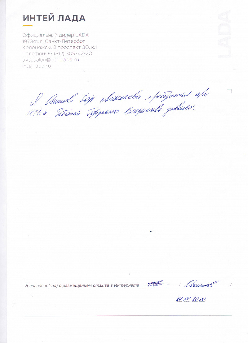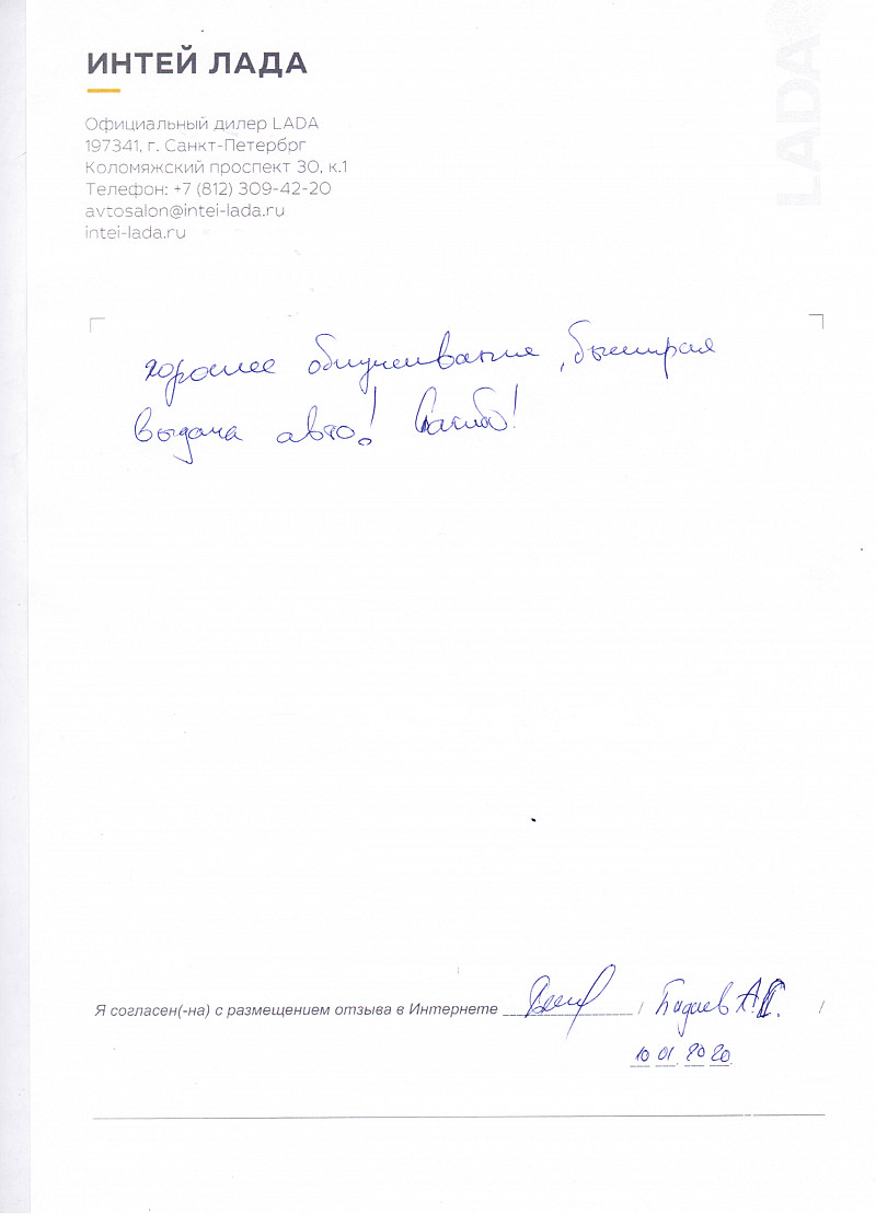Приятный и теплый прием в автосалоне "ИНТЕЙ ЛАДА". Отличное обслуживание. Никаких лишних вопросов со стороны менеджеров; все по делу. Отдельно хочу отметить менеджера Ксению Иванову. Спасибо всему персоналу. |