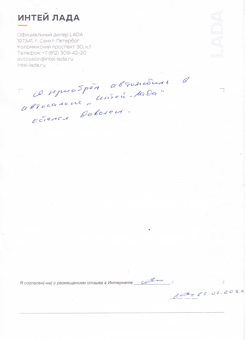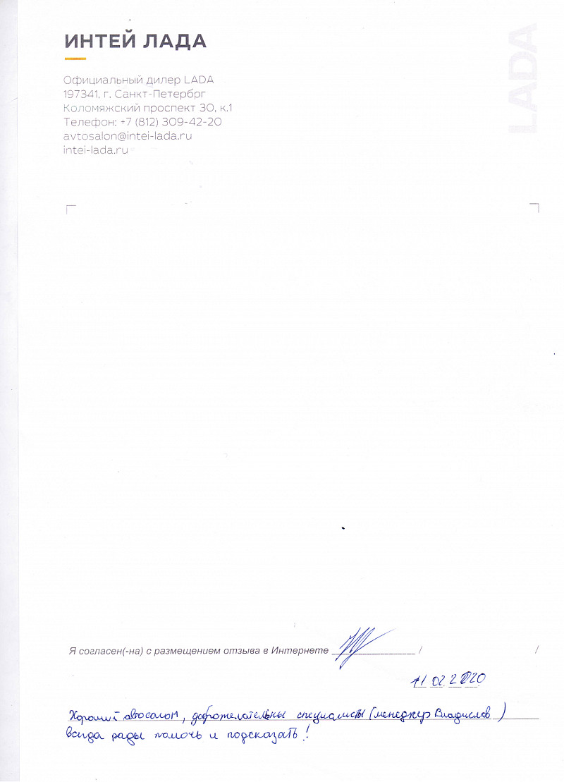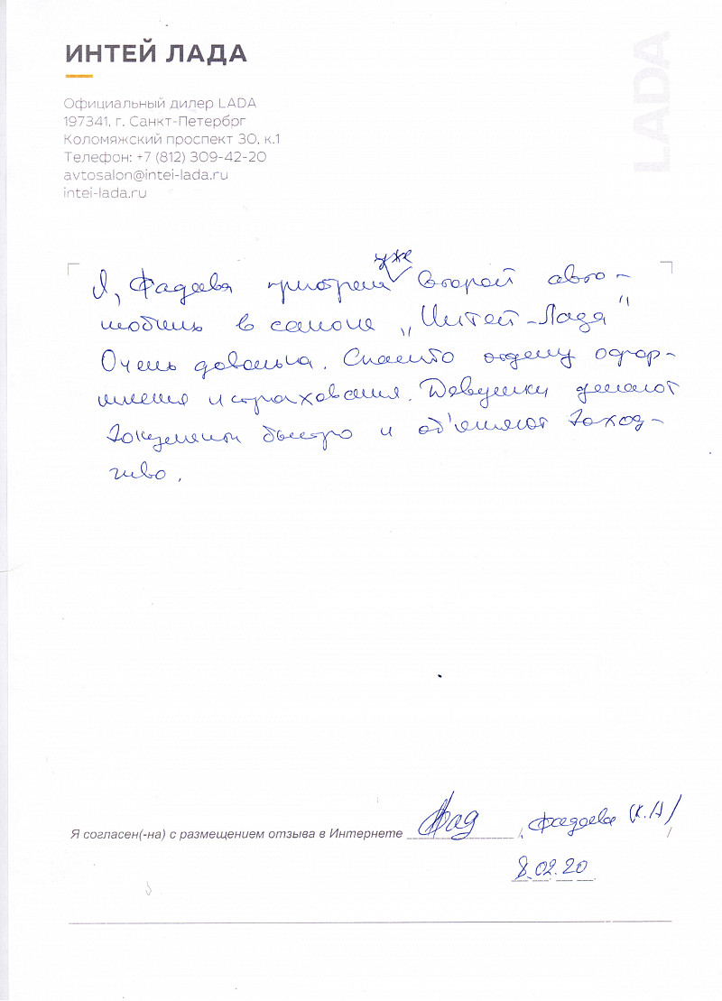 Я, Фадеева, приобрела уже второй автомобиль в салоне "Интей Лада". Очень довольна. Спасибо отделу оформления и страхования. Девушки делают документы быстро и объясняют доходчиво. |
