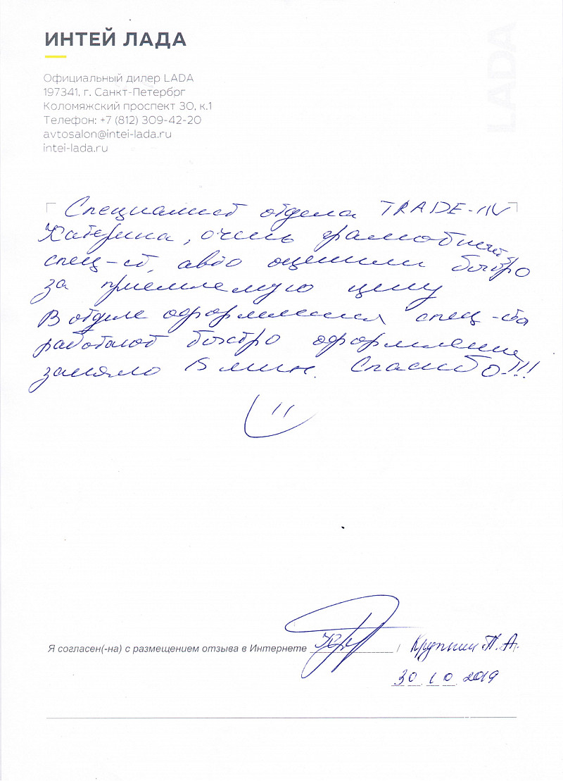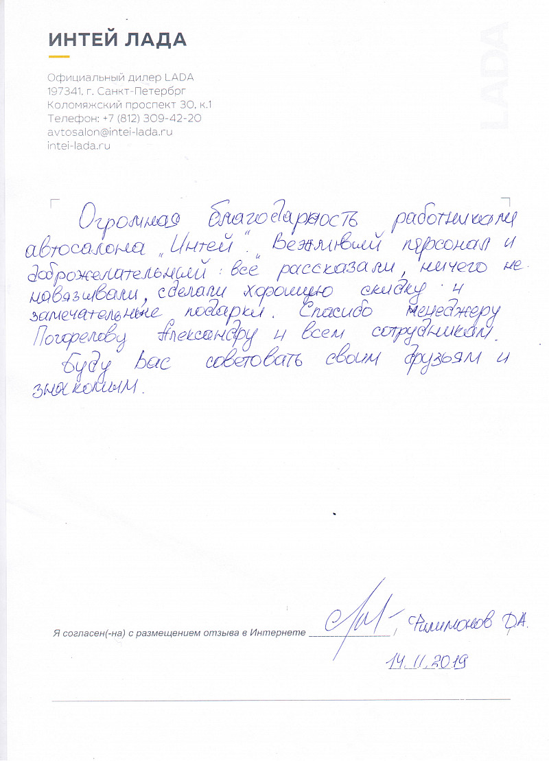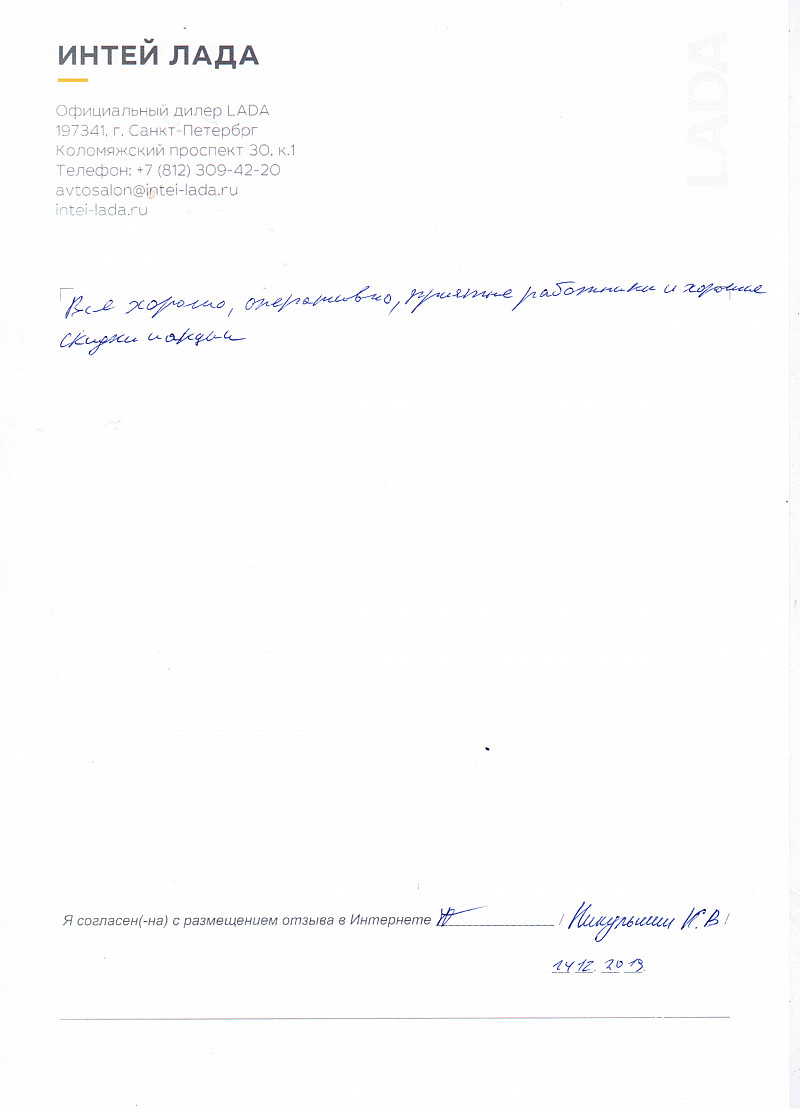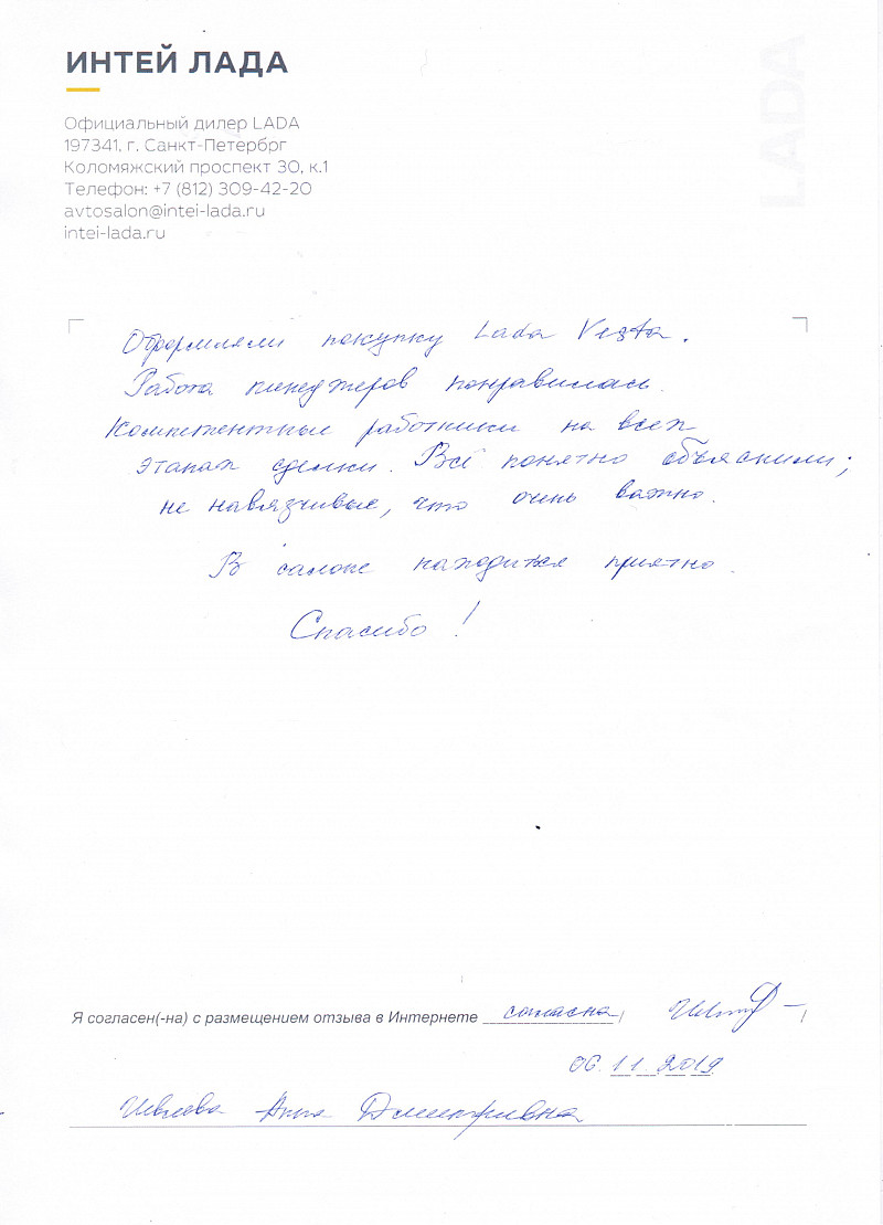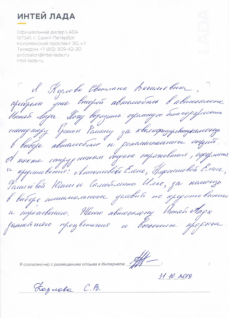 Я, Козлова Светлана Васильевна, приобрела уже второй автомобиль в автосалоне Интей Лада. Хочу выразить огромную благодарность менеджеру Гротан Роману за квалифицированную помощь в выборе автомобиля и дополнительных опций. А также сотрудникам отдела страхования, оформления и кредитования: Липатовой Елене, Нифонтовой Елене, Фомичевой Юлии и Самойленко Илье. За помощь в выборе оптимальных условий по кредитованию и страхованию. Желаю автосалону Интей Лада дальнейшего процветания и высоких продаж. |