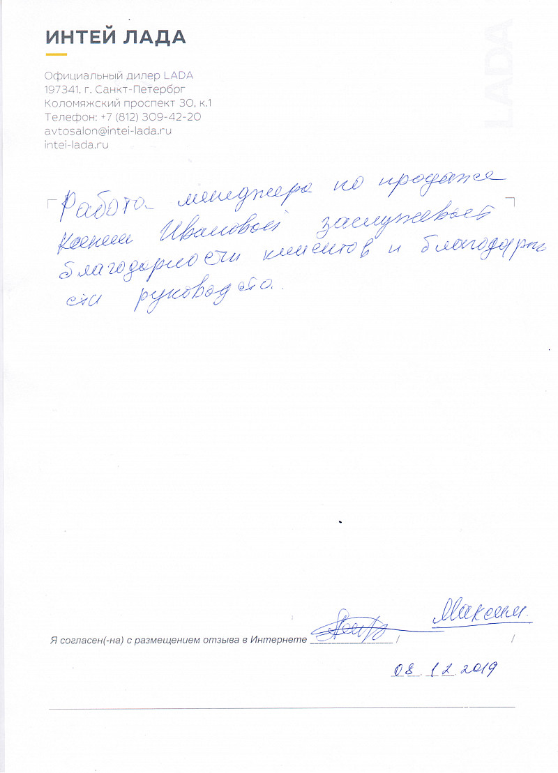 Я, Богачев Александр Евгеньевич, приобретал в салоне Интей Лада автомобиль Лада XRAY, в работе менеджера остался доволен. |