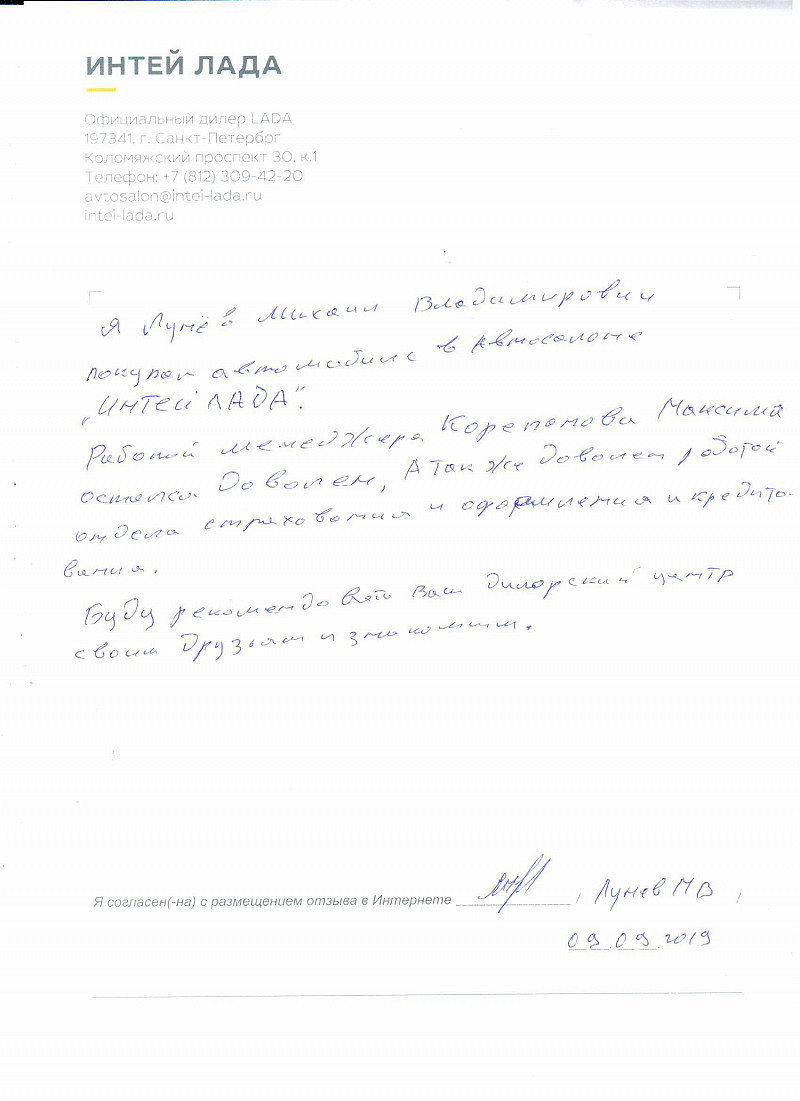 Я, Лунев Михаил Владимирович покупал автомобиль в автосалоне "Интей Лада". Работой менеджера Корепанова Максима остался доволен, а так же доволен работой отдела страхования и оформления , и кредитования. Буду рекомендовать Ваш дилерский центр своим друзьям и знакомым. |