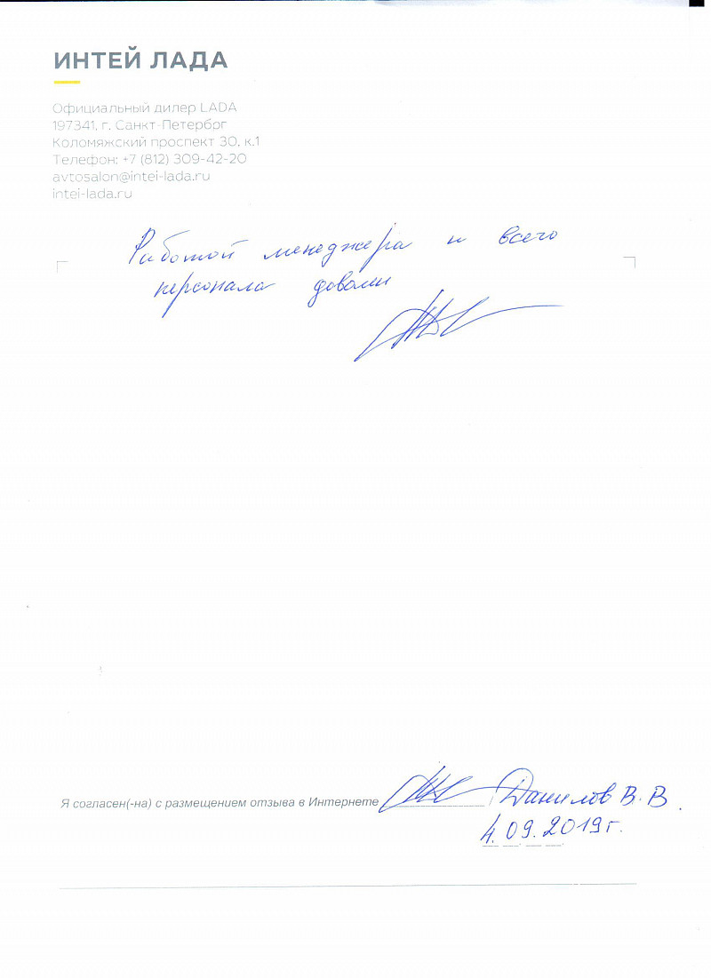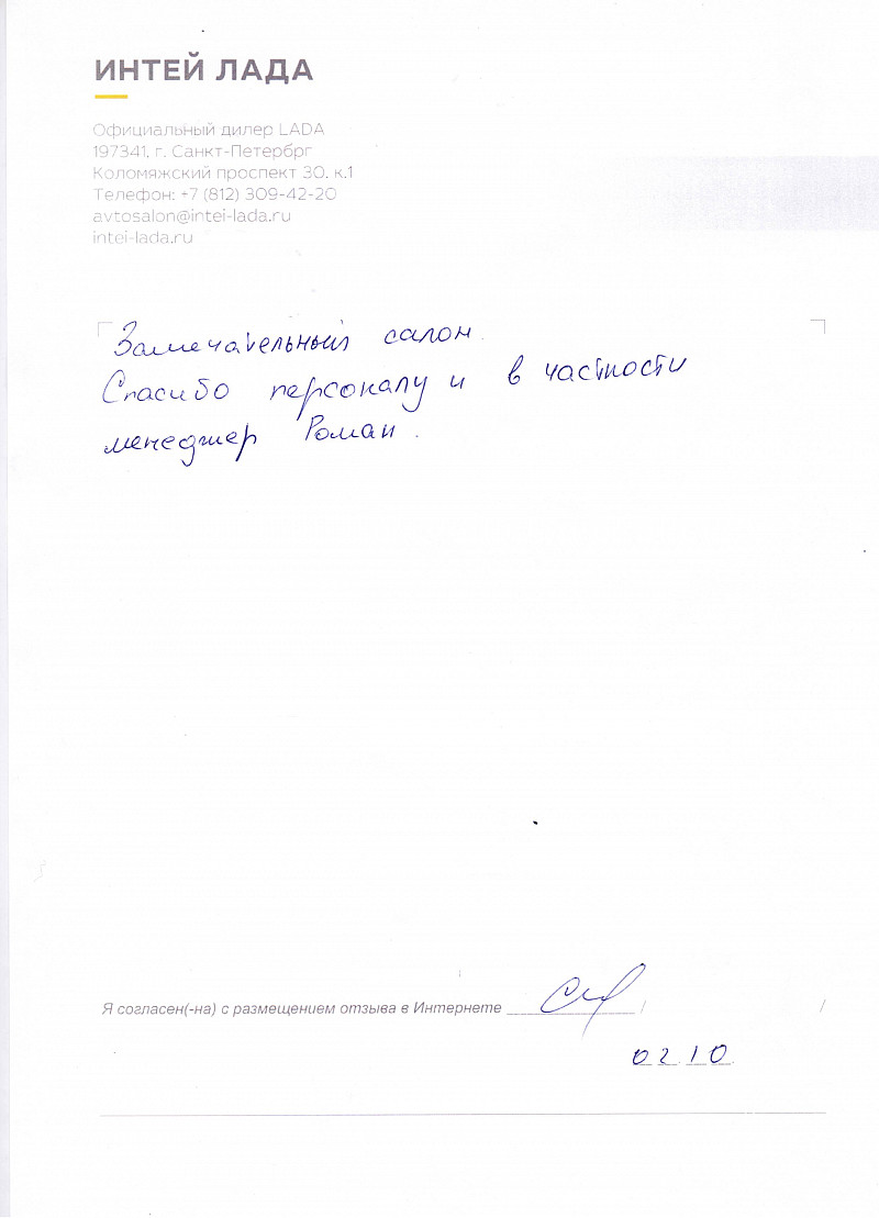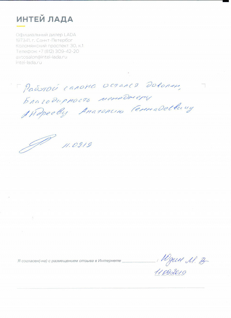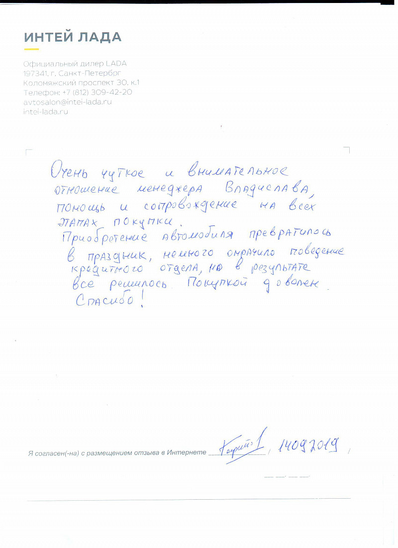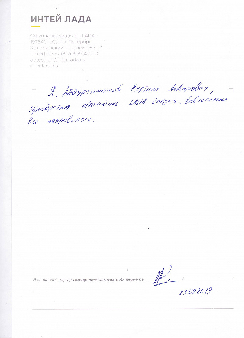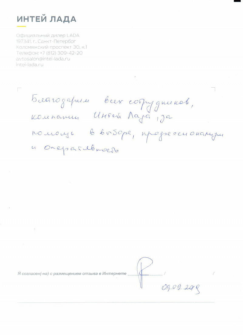 Благодарим всех сотрудников компании "Интей Лада" за помощь в выборе, профессионализм и оперативность. |