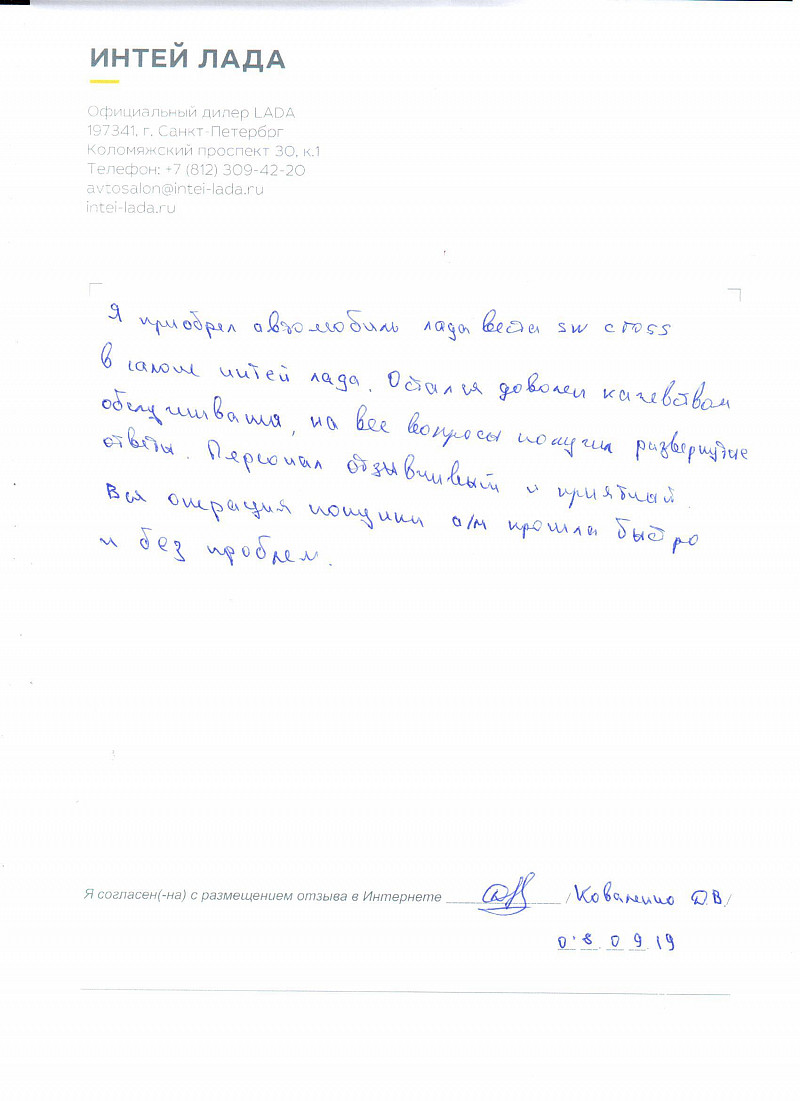 Я приобрел автомобиль лада веста sw cross в салоне "Интей Лада". Остался доволен качеством обслуживания, на все вопросы получил развернутые ответы. Персонал отзывчивый и приятный. Вся операция покупки а/м прошла быстро и без проблем. |